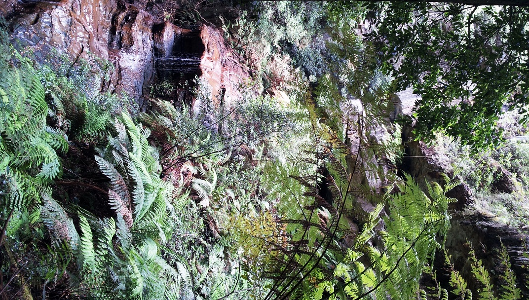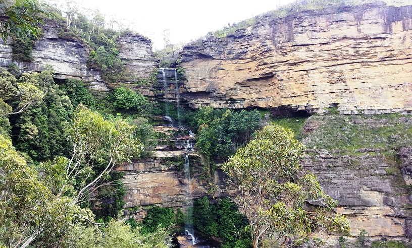 We first rode the Skyway across the gorge and the views were breathtaking! It’s easy to see where their name comes from. The smoky blue peaks stretched out across the horizon in stunning, panoramas. Once we reached the far side, we boarded the railway and zipped to the station near the bottom of the valley. There were several trails carved into the sandstone walls of the cliffs so we chose one of the longer ones and set out for our first Blue Mountain hike. This wooded area is what is known as a mixed forest – a combination of evergreen, deciduous and some tropical flora including tall Norfolk pines, huge eucalyptus trees, mosses and fiddlehead ferns to name a few. We hiked along soaking in the ambiance created by the dense variety of plants, sheer striated cliffs, and tumbling waterfalls. This is heaven.