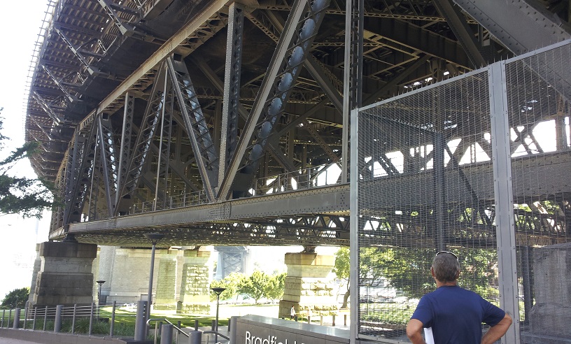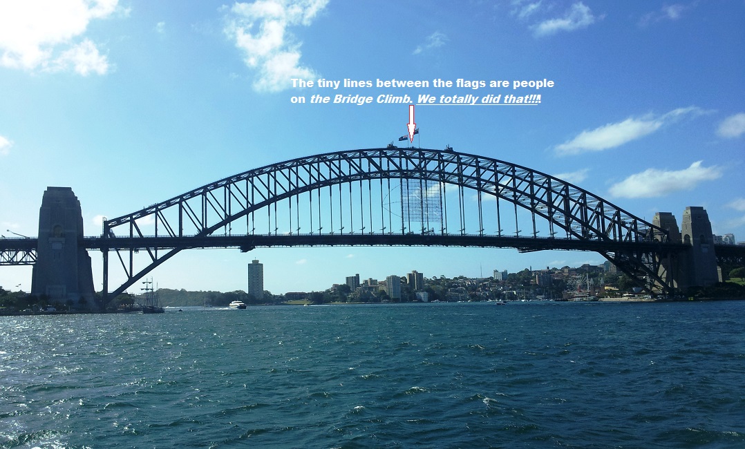 Our Thursday adventure was a huge one on our bucket list. As Tom says, “We got high – literally!!!!!! Wait for it, okay; TOM AND I CLIMBED THE SYDNEY HARBOR BRIDGE!!! I’m not talking about walking from one side of the bridge to the other. We’d already done that several times and while the walk was great, it’s not really an adventure. I’m talking about the climb to the top of the arch which was beyond awesome! We headed down to the Quay early so we would be there on time and ended up being over an hour early – eager? We walked around downtown for a bit and then headed into the Bridge Climb Museum which was a very interesting about the building of the bridge.