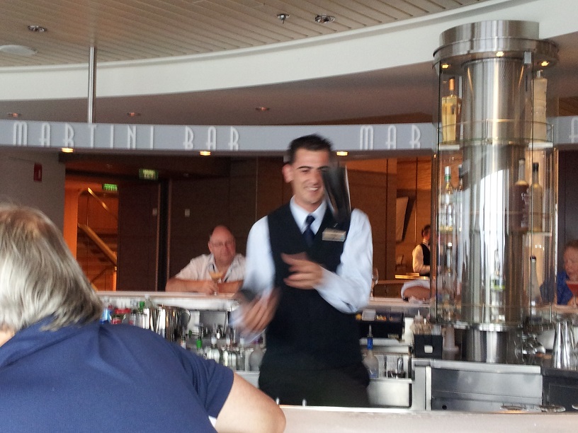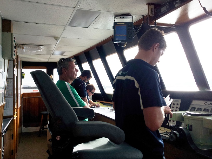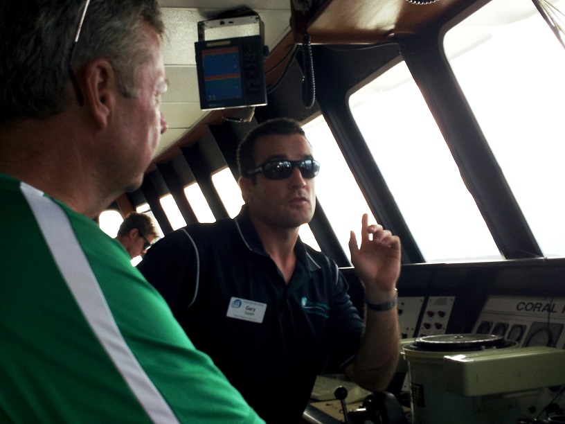 Tom and I spent about an hour or so on the bridge with the captain. Captain Gary is very young, handsome, charming and friendly. He’s also Irish and talks with a lilting brogue. He chatted with Tom about the charts, technology, etc. and I took in the scenery. (I did get to drive the boat a couple days later for about two minutes. I backed it up about 10 meters to the right position for our next snorkel.