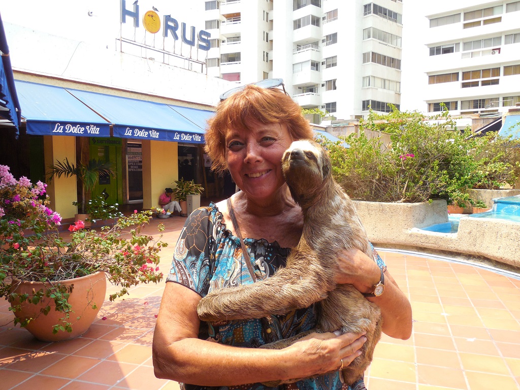 We ended our historic tour with shopping at one of the slightly more up-scale places in Cartagena. I didn’t buy anything, but I did get a chance to take a picture of some of the local women in native costume and to meet my very first three toed sloth.