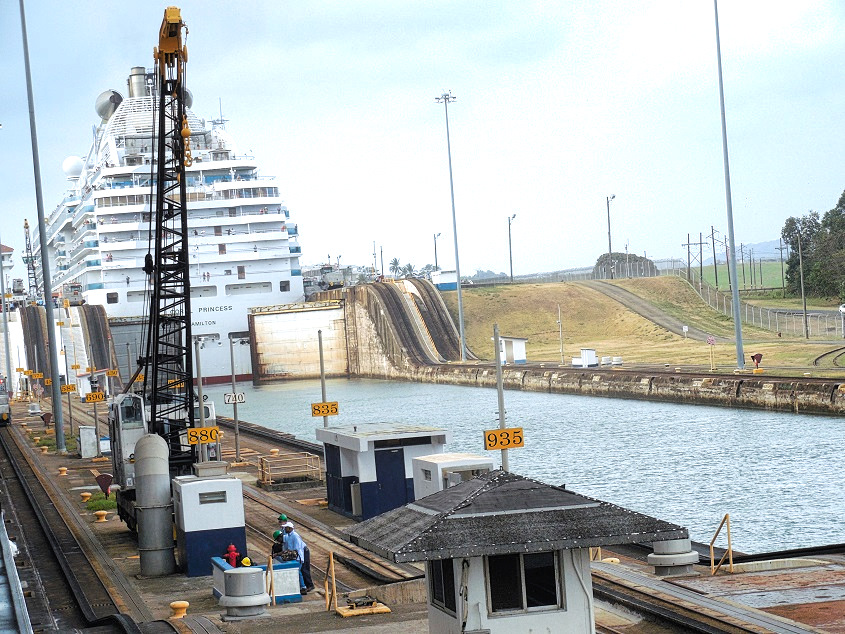 Before I go on, let me explain a bit about the Panama Canal. It was built to provide a deep channel connection between the Atlantic and Pacific oceans. Part of the dilemma in this process is that it is a looong channel and the oceans are basically different heights. So the locks act as an elevator raising a ship up by maneuvering it into a lock/elevator lift and pumping water into or out of the lock to raise or lower the ship to the next level.