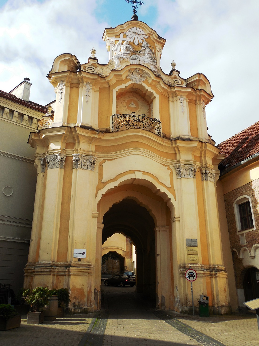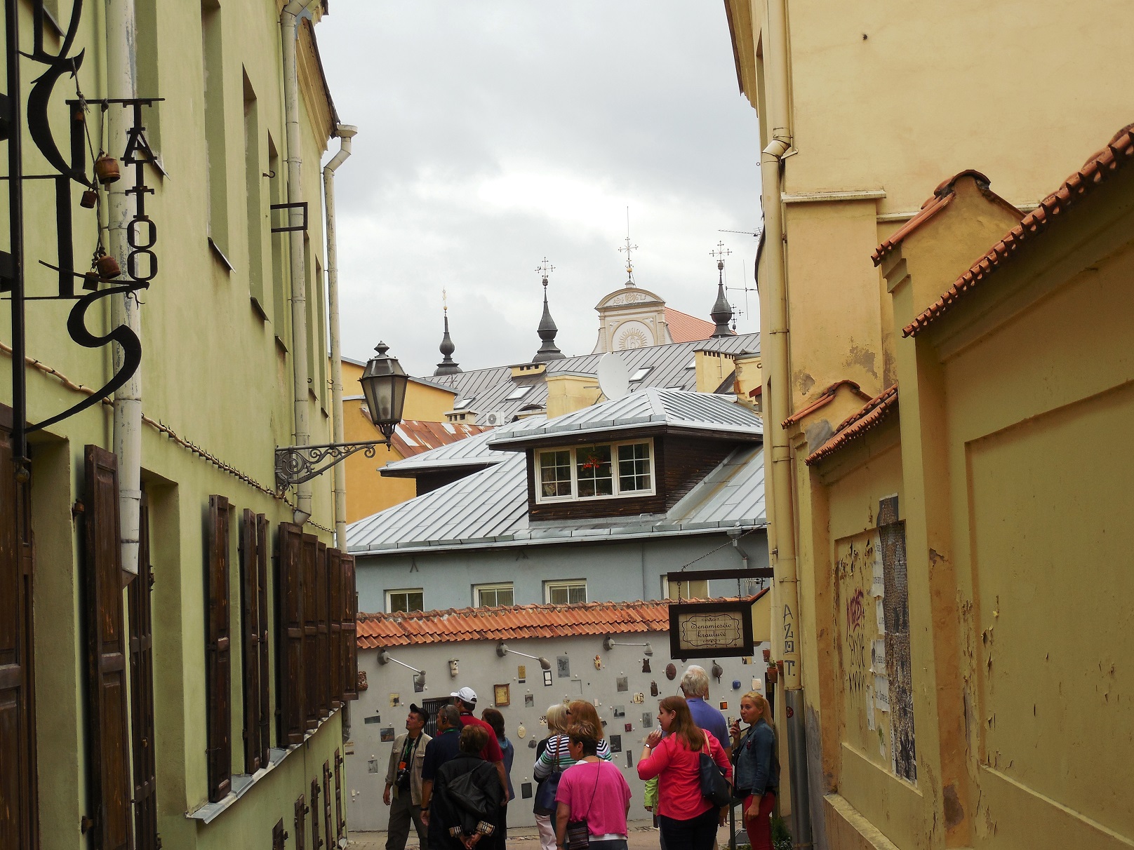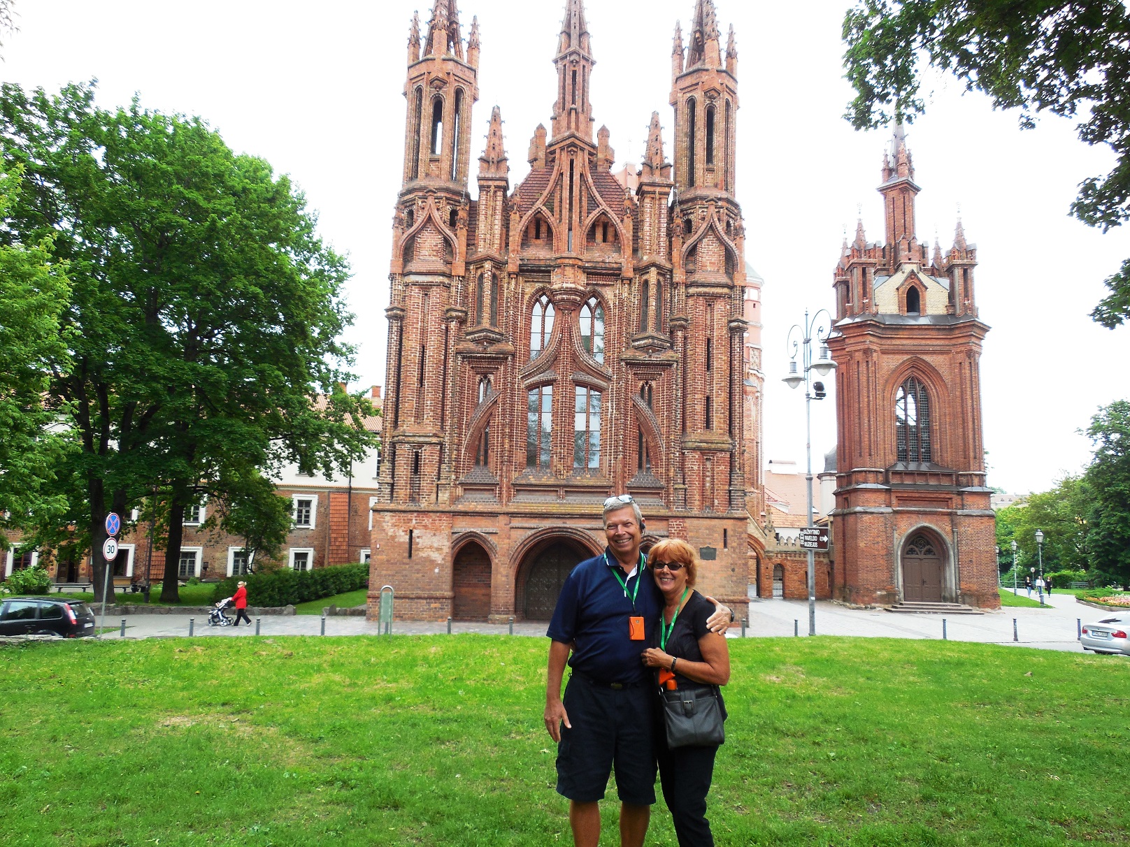 Our tour took us down narrow and charming streets and alleys.Literacy Street – All along this alley there were plaques dedicated to Lithuania’s poets and writers.Quaint shopsTom and I in front of St. Anne’s Church – not the St. Ann’s that we were married in.Short tunnels into interior courtyards gave us a glimpse of homes, shops, and Vilnius Old Town life