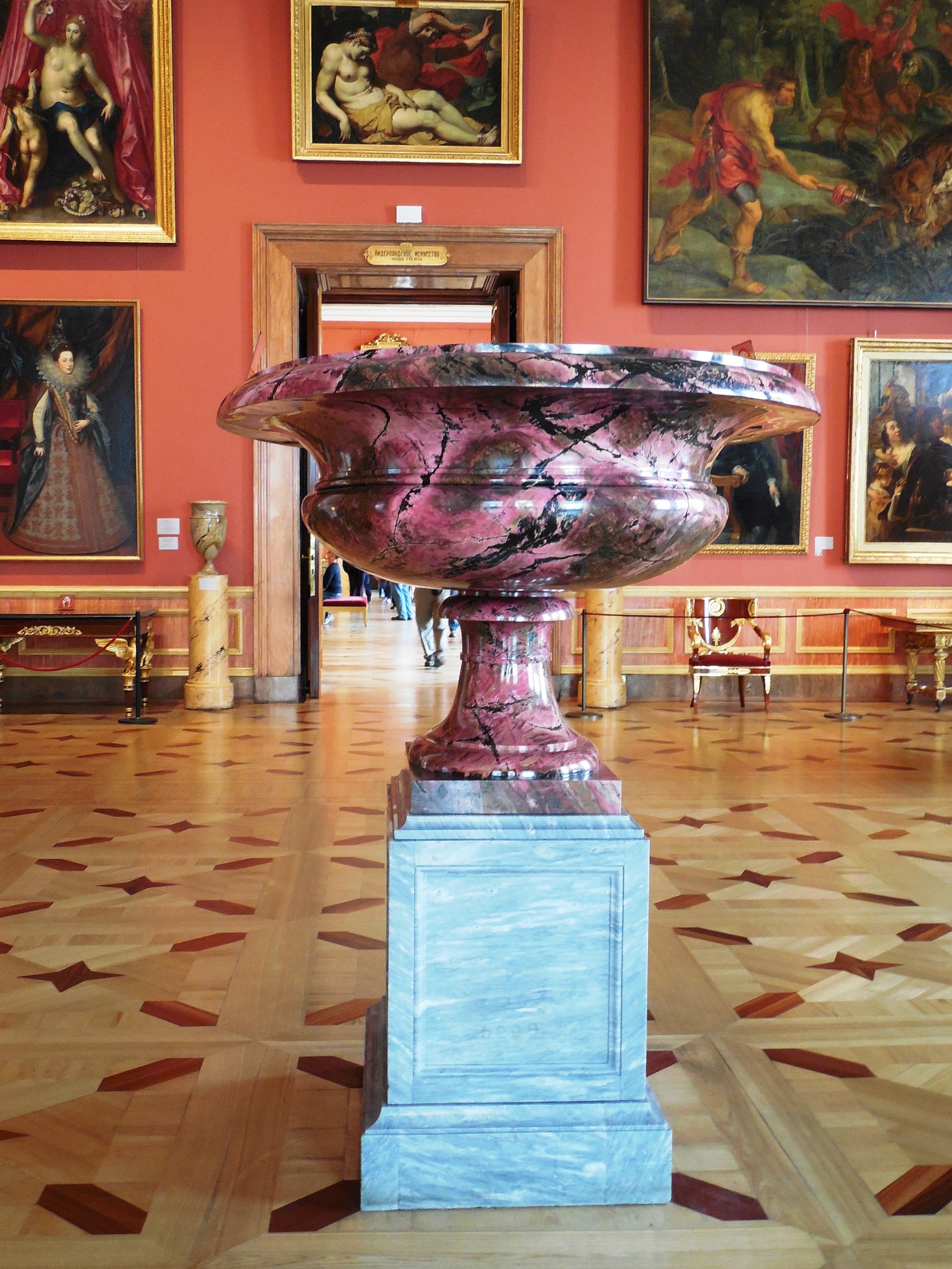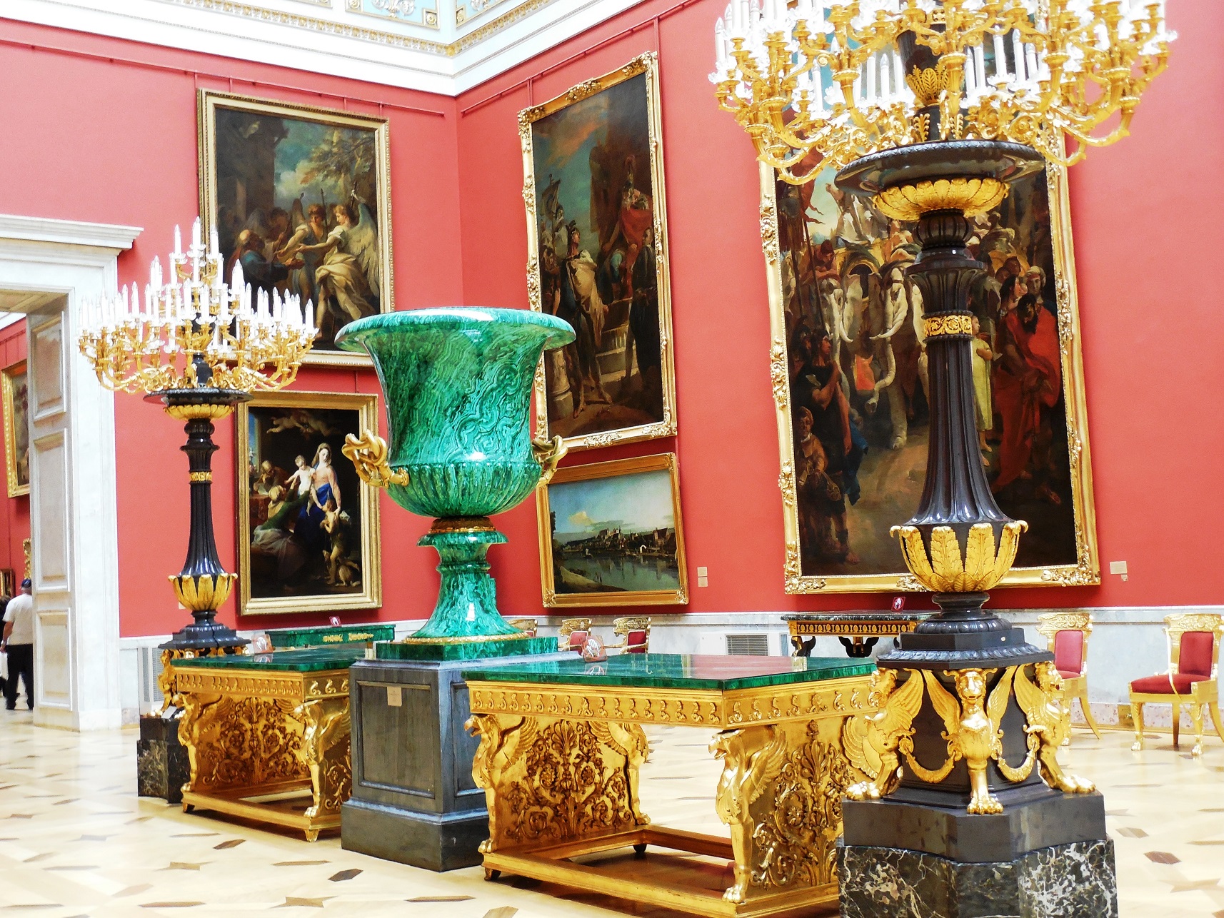 The glorious entrance to the Hermitage MuseumHuge and magnificent Urns, this one made of rhodonite.BreathtakingExquisite works of art from ceiling to floor. This urn is malachite – one of my favorites.