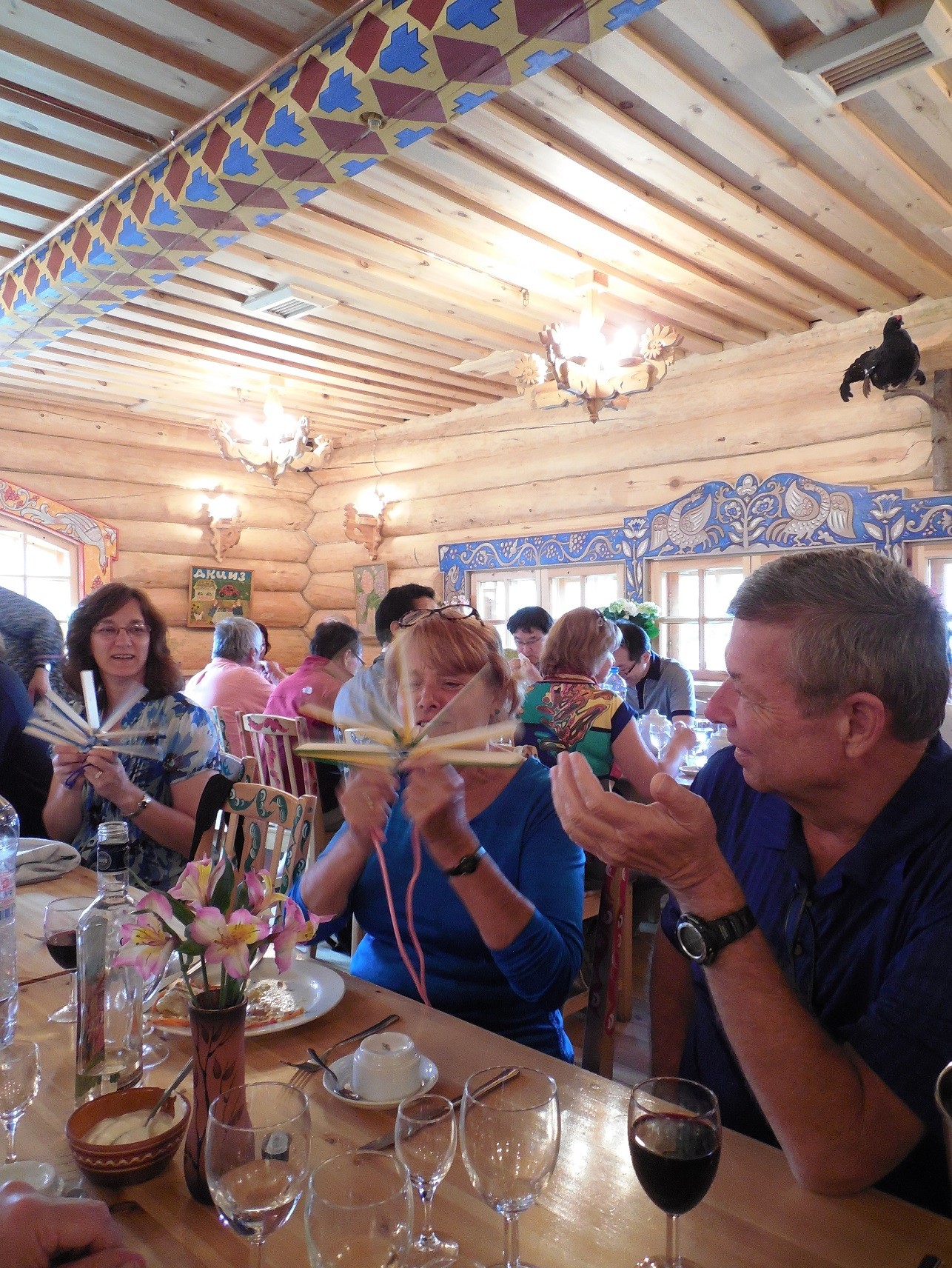 Joining in the band we played clackers – fun.Even the vodka bottles were beautiful – especially after partaking of the vodka. Does this look blurrry to you?We were serenaded with rousing folksongs, accordion playing, boisterous sing and dancing – delightful!A powerful voice singing Russian folksongs.